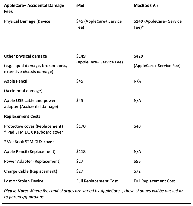 Devices are covered by AppleCare+ warranty for three years, which includes repairs or replacement for most hardware faults and limited accidental damage incidents. If a device develops a fault, it will be repaired or replaced quickly by SCEA’s IT team and Winthrop Australia. If the device or accessories are damaged and not covered by warranty, the following costs will be added to the school fees: